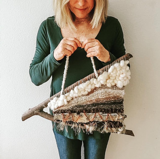 Nature is both her muse and medium. “Being a fiber and mixed media artist, and surrounded by the stunning natural environment of Idaho, I can’t help but incorporate nature’s elements into my woven wall hangings.” Her looms are often crafted from y-shaped branches or repurposed objects. “Lately, I weave on bicycle wheels, wood tennis rackets, farm tools, and old metal sprockets,” she says with a grin. “Just in case you come across a vintage car grill... please give me a call! Really... I mean it.”